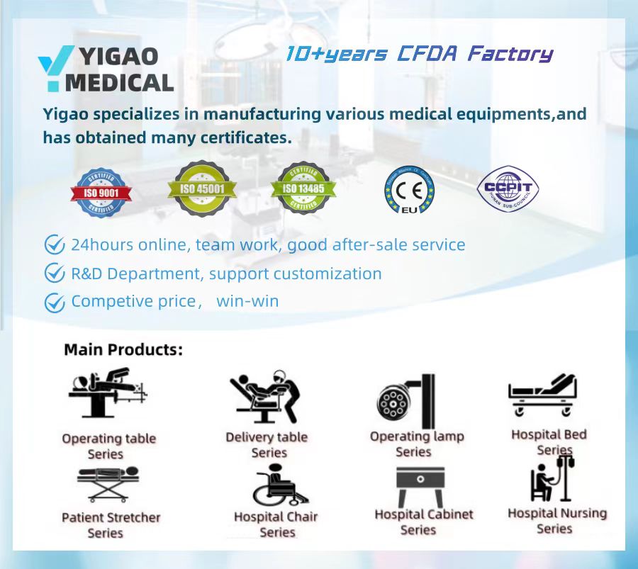 Tıbbi ekipmanların araştırma ve geliştirme, üretim, satış ve servisine odaklanan profesyonel bir fabrikayız. Ana ürünlerimiz arasında ameliyat masaları, doğum yatakları, hastane yatakları vb. yer almaktadır ve modern tıp kurumlarının çeşitli ihtiyaçlarını karşılamaya kendimizi adadık.