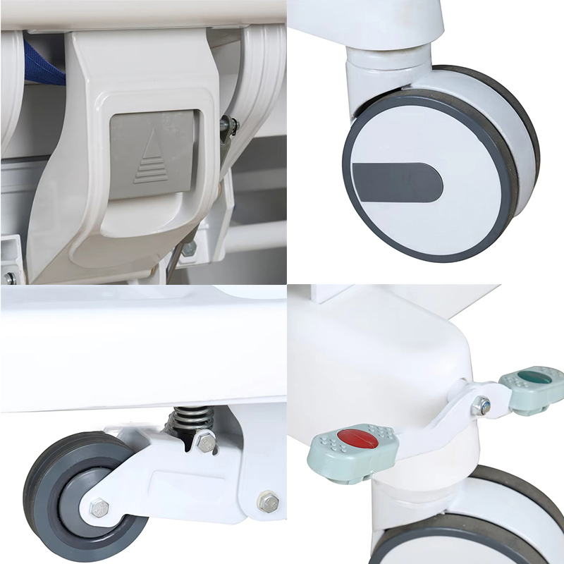 5. Transfer aracı tekerlekleri sessiz, sağlam ve güvenilir olan 4 adet 6 inçlik çift sıralı merkezi kontrol tekerleğidir. Aynı zamanda kullanıcının araç gövdesinin yönünü kontrol etmesini kolaylaştırmak için bir kılavuz tekerlek cihazı ile donatılmıştır. Bir kişi kolayca çalıştırabilir; bu daha rahat ve idealdir;